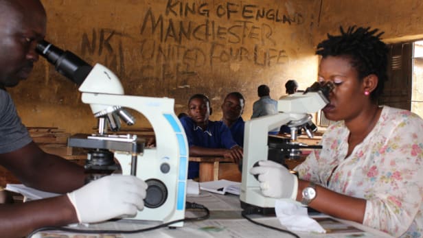 | Lab technicians review samples during baseline mapping for schistosomiasis and soil-transmitted helminths in Nigeria. Photo by: RTI / CC BY-NC-ND |